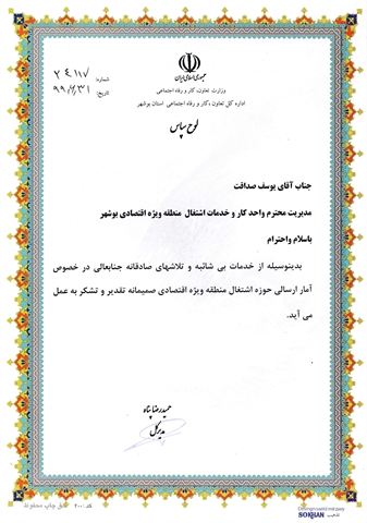مدیرکل تعاون، کار و رفاه اجتماعی استان بوشهر با اهدا لوح سپاس از مدیر واحد کار منطقه ویژه قدردانی کرد.